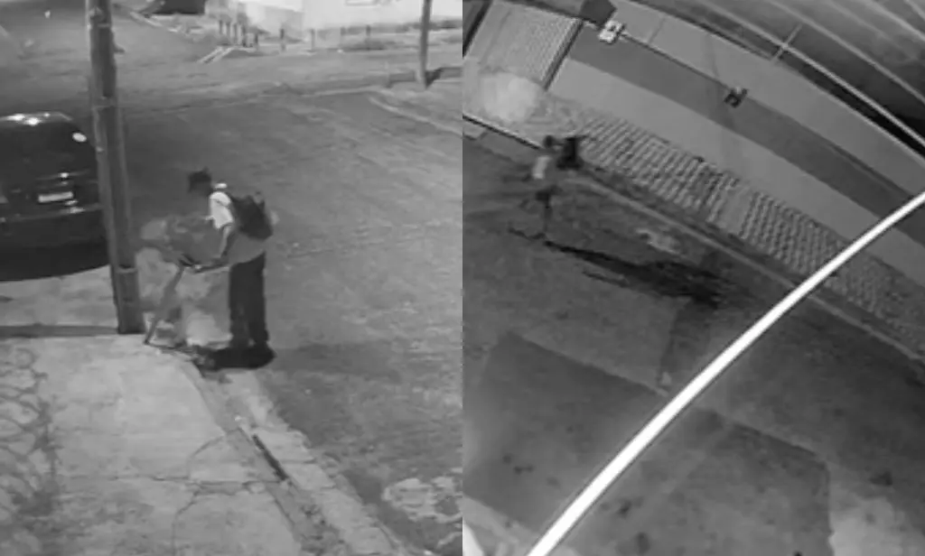 Logo em seguida, as câmeras da rua Amazonas, também na zona Norte, mostram os mesmos indivíduos repetindo o ato. As imagens revelam que o segundo criminoso remove outra lixeira antes de ambos se afastarem.