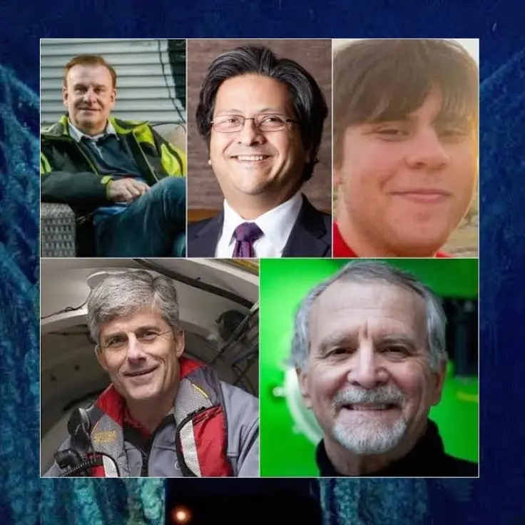 Entre os tripulantes estavam o CEO da OceanGate, Stockton Rush, criador do submarino Titan; o empresário paquistanês Shahzada Dawood e seu filho, de 19 anos, Sulaiman Dawood; o empresário Hamish Harding e o mergulhador francês Paul-Henry Nargeolet.