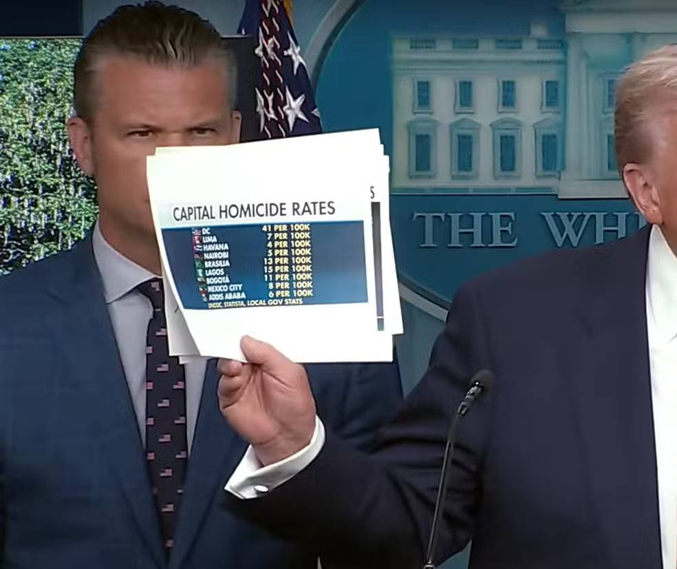 Trump apresentou gráficos que indicam uma taxa de homicídios em Washington próxima a 40 por 100 mil habitantes, comparando com Brasília, que teria índice menor, mas ainda elevado. Dados oficiais do Atlas da Violência apontam que, em 2023, o Distrito Federal registrou 347 homicídios, contra 274 em Washington.