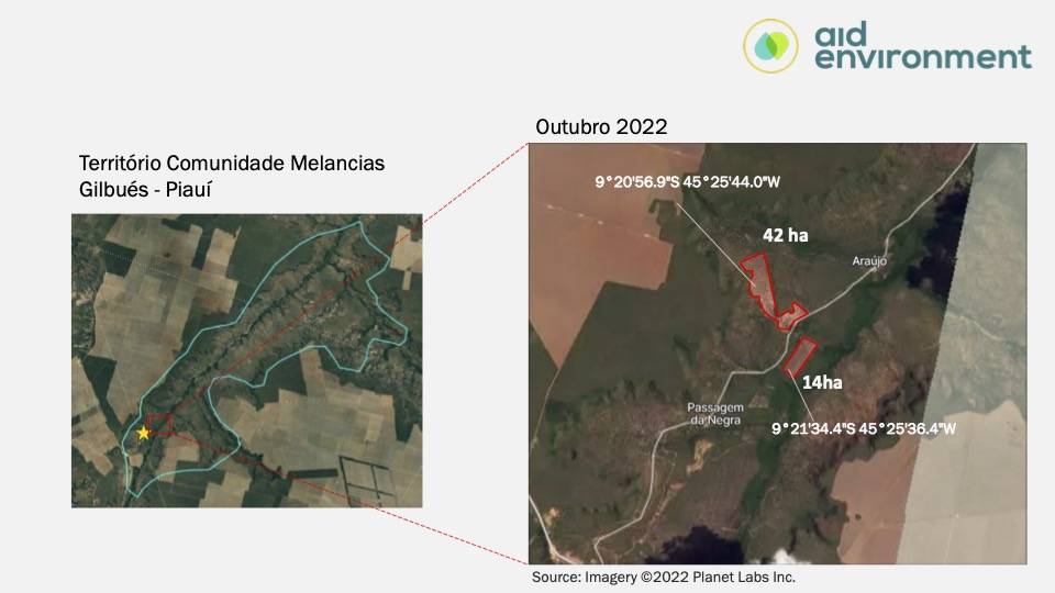 Na cidade de Gilbués, moradores denunciaram ameaças ambientais e invasões na comunidade tradicional Melancias. Como é possível verificar na imagem abaixo, uma grande área já foi desmatada e apesar de vários órgãos atuarem para proteção da área e moradores, o desmatamento se intensifica.