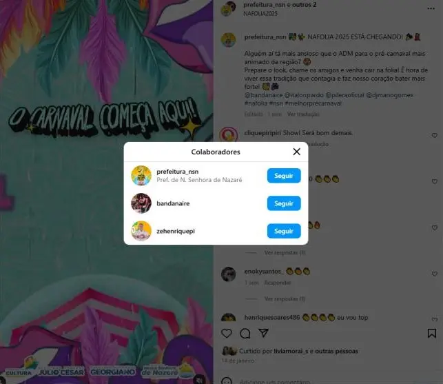 A ação aponta que, desde que assumiu o cargo em 2021, e após sua reeleição em 2024, o prefeito tem utilizado bens e serviços públicos – incluindo o perfil oficial da Prefeitura no Instagram (@prefeitura_nsn) – para autopromoção.