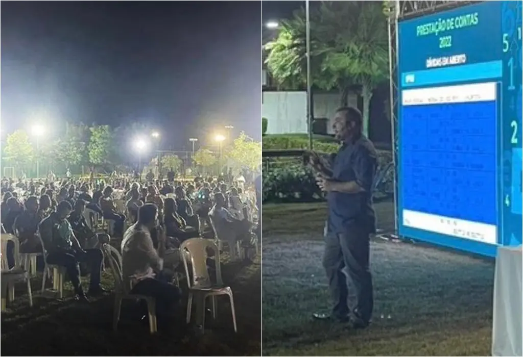 O presidente do conselho diretor, Reginaldo Palácio, começou a assembleia com esclarecimentos. "Eu moro aqui desde 2016, fui o oitavo morador aqui, vi a evolução, todas as fases, a gente está aqui hoje e me disponibilizo para tecer esclarecimentos, o que vai ser apresentando é o que está lançado desde janeiro de 2022".