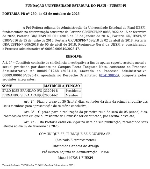 A sindicância foi oficializada por meio da Portaria nº 250, datada de 3 de outubro de 2025, e publicada no Diário Oficial do Estado na segunda-feira (6). O documento determina a criação de uma comissão de sindicância composta por dois servidores da Fundação Universidade Estadual do Piauí (FUESPI), que serão responsáveis por conduzir a investigação.