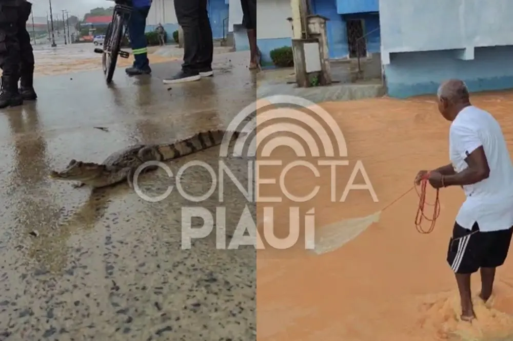 Vídeo mostra homem pescando e um filhote de jacaré na calçadaUm trecho alagado da avenida Joaquim Nelson no bairro Dirceu, zona Sudeste de Teresina, chamou atenção nesta sexta-feira (7). Nas imagens registradas no local, um homem aparece pescando na área inundada, enquanto um filhote de jacaré nada nas proximidades.