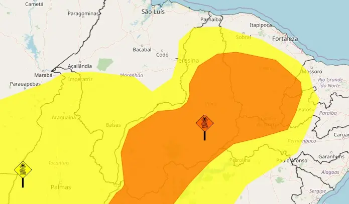 O alerta amarelo atinge as regiões Sudeste Piauiense, Centro-Norte Piauiense, Sudoeste Piauiense e Norte Piauiense.