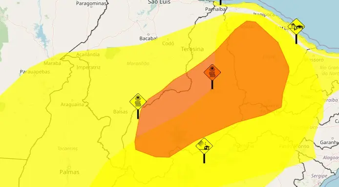 Alerta amarelo de vendaval – perigo potencial de vento variando entre 40 km/h e 60 km/h. Baixo risco de queda de galhos de árvores. As áreas afetadas serão Sudeste Piauiense, Sudoeste Piauiense, Centro-Norte Piauiense, Norte Piauiense. O alerta é válido até este sábado (09).