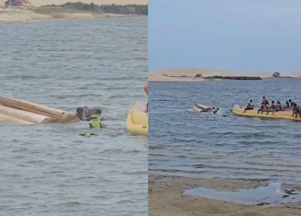 "Teve um incidente aqui no portinho, o barco que puxa aquela boia grande lá com o pessoal fazer o passeio, virou, virou bem na saída e no barco tinha um pai que levou uma criança de um ano, daí o pai acabou perdendo ela do colo, caiu do colo dele, foi aquele desespero pra achar a criança embaixo do barco, né, virado, mas graças a Deus deu tudo certo, a criança bebeu um pouquinho de água, mas tá tudo bem", relatou uma pessoa que acompanhou a situação.