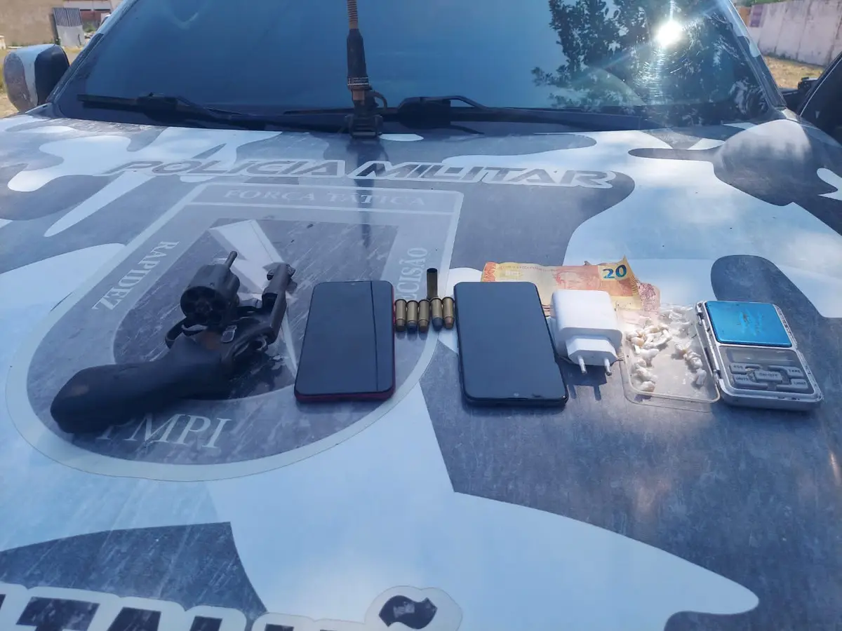 Os policias conseguiram abordar um suspeito e com o mesmo foi encontrado um revólver calibre 38, cinco munições intactas, uma cápsula, uma balança de precisão, um celular, R$ 50,00 em espécie e 21 invólucros de substância análoga ao crack.