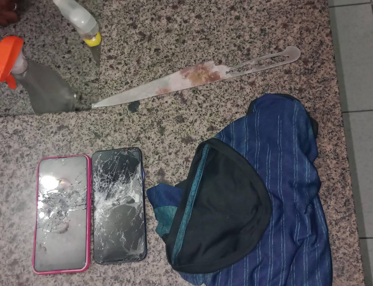 Com ele, os policias apreenderam dois celulares, uma faca e uma camisa que teria sido furtada na região. Ele não quis informar a origem dos objetos e os celulares quebraram durante a fuga.
