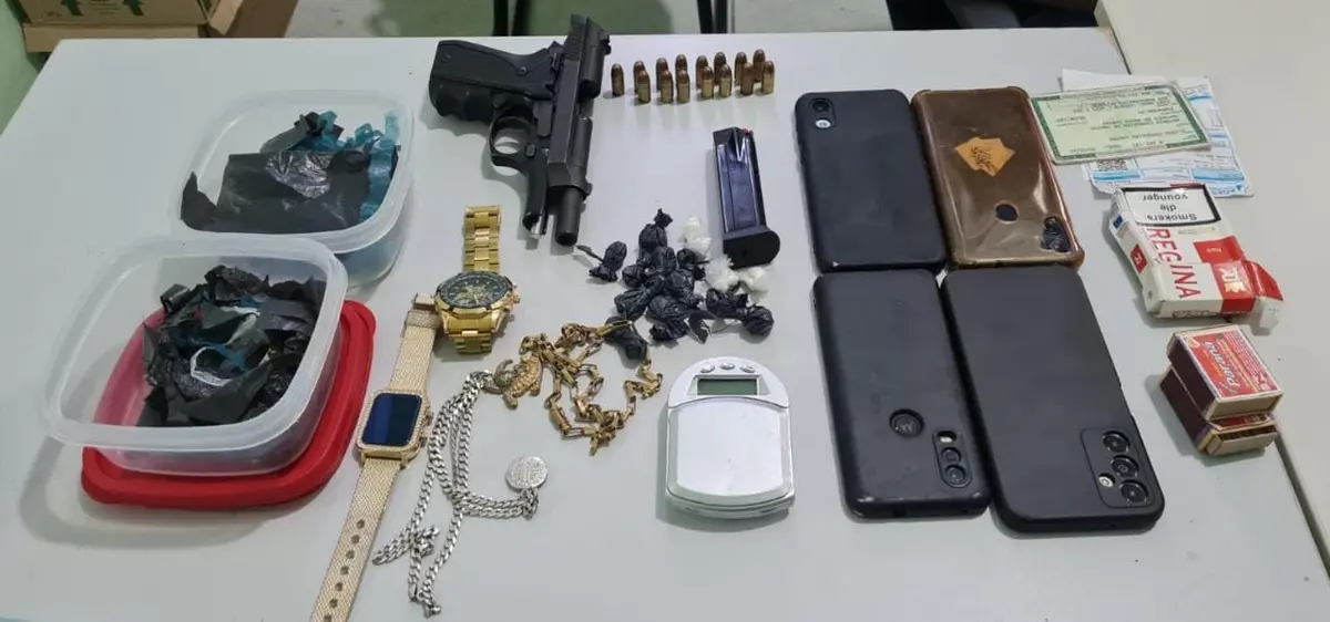 Em seguida, as equipes foram até o local indicado e o três suspeitos fugiram para a casa abandona, onde as equipes já estavam esperando e deram voz de prisão. Com eles foram encontrados uma pistola calibre 380, um carregador de pistola 380, quinze munições intactas, dois relógios, uma balança de precisão, quatro trouxinhas de cocaína, 11 trouxinhas de maconha, joias e celulares.