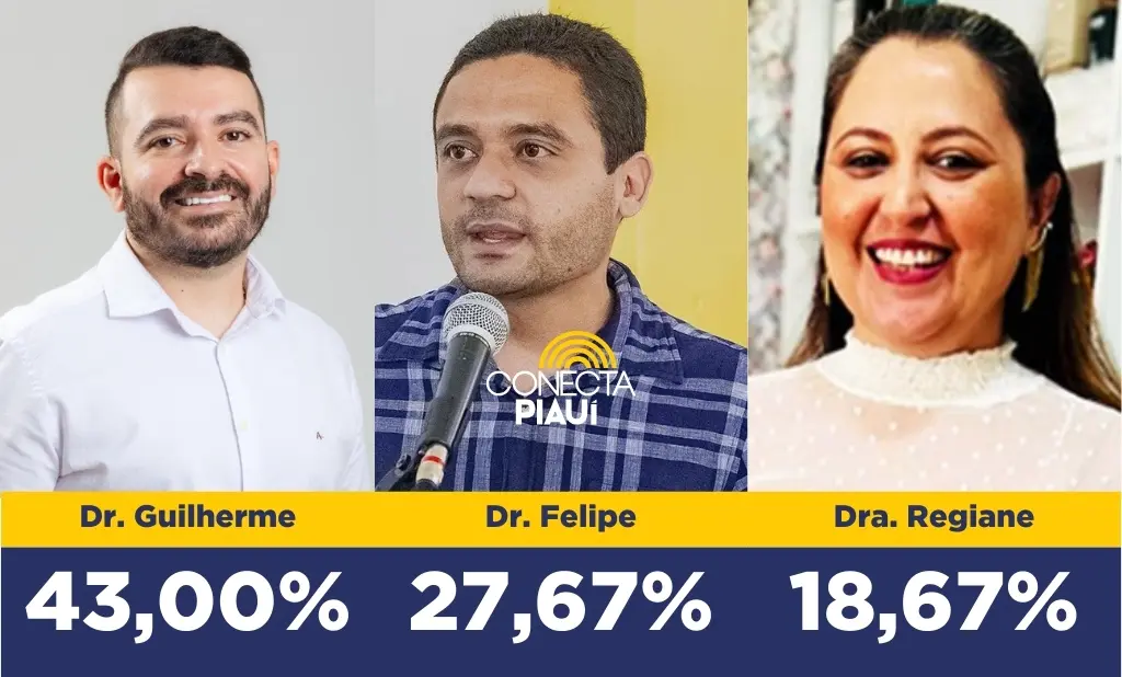 De acordo com os dados, o pré-candidato Dr. Guilherme, vence com 43% dos votos com os apoios de Rafael Fonteles, Lula, Wellington Dias, Dep. Hélio e Sec. Daniel Oliveira.