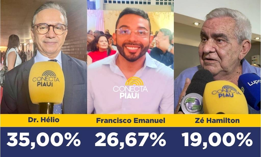 Na pesquisa estimulada, Dr. Hélio avança com 35% dos votos, enquanto Francisco Emanuel aparece com 26,67%, seguido pelo ex-prefeito Zé Hamilton, com 19%. Entre os eleitores indecisos ou que não souberam opinar, somam 14,67%, e 3,50% dos entrevistados devem votar em branco, nulo ou em nenhum dos candidatos.