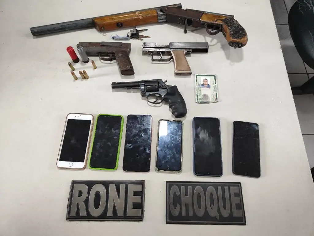 Foram apreendidos um veículo da marca Ford, modelo KA, de cor prata, placa QQF-5949; duas armas de fabricação artesanal tipo pistola; um revólver cal.38, marca Taurus; uma espingarda cal.12; cinco munições intactas cal.38; dois cartuchos cal.12; três celulares da marca Samsung; um celular da marca Motorola e um celular da marca iPhone.