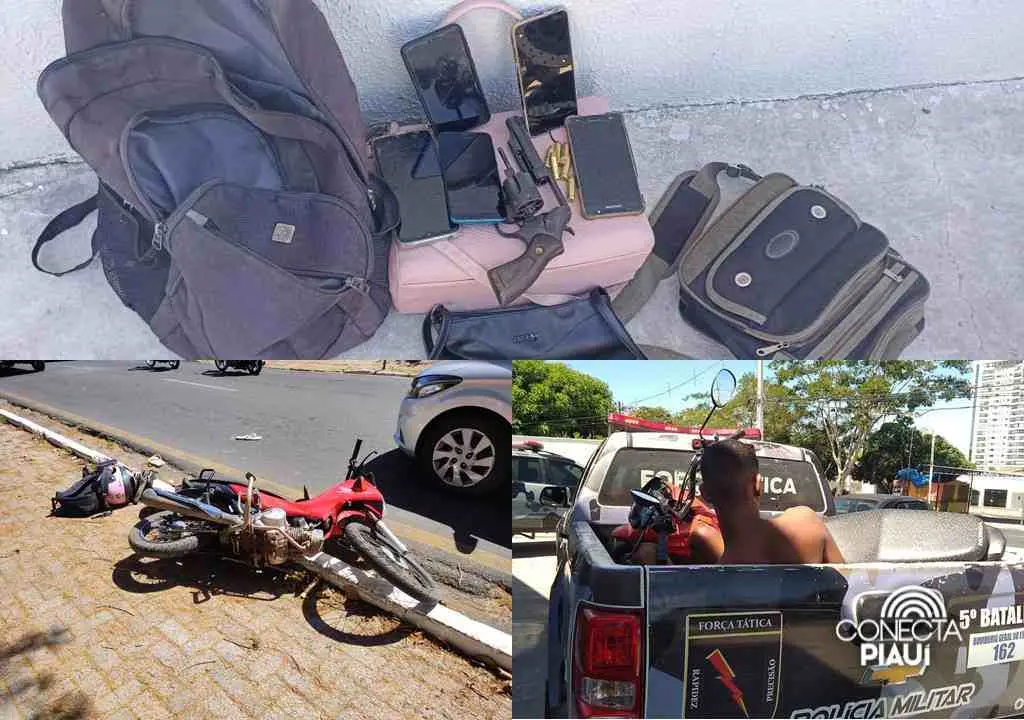 Com os indivíduos foi apreendida uma arma de fogo, munições e outrosNesta quarta-feira (12/07), a Polícia Militar (PM-PI), através do 5° Batalhão, prendeu dois suspeitos de assalto, sendo um adulto e um menor, na Avenida João Antônio Leitão, bairro Piçarreira, na zona Leste de Teresina. Com os indivíduos foi apreendida uma arma de fogo, munições, uma motocicleta e quatro bolsas das possíveis vítimas.