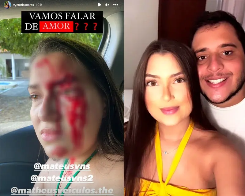 Em suas redes sociais, a jovem compartilhou uma foto com o seu rosto cortado após as agressões sofridas pelo companheiro. Segundo ela, o homem teria jogado a porta do apartamento contra ela. Imagens mostram parte dos cílios de Victoria na porta do imóvel e manchas de sangue no chão.