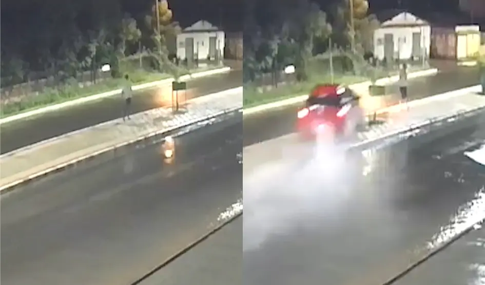 As câmeras de segurança de uma propriedade registraram o momento em que o pedestre estava caminhando pelo passeio da Avenida Chagô Rebelo, e segundos depois o carro desgovernado invadiu a via, subindo no meio-fio, colidindo com um canteiro e descendo o aterro do outro lado.