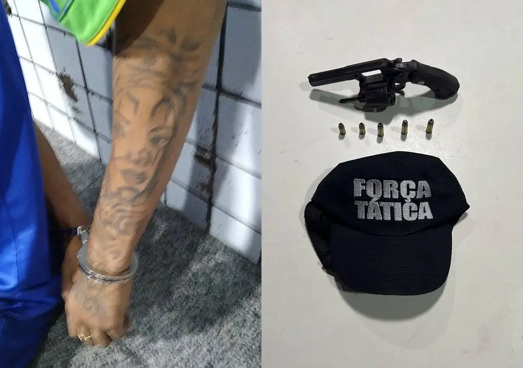 Segundo a PM, o suspeito, ao perceber a aproximação da equipe saiu correndo e pulando vários muros, mas foi capturado. Com o mesmo foram encontrados uma arma de fogo calibre 32 N 845673, cinco munições intactas e um celular.