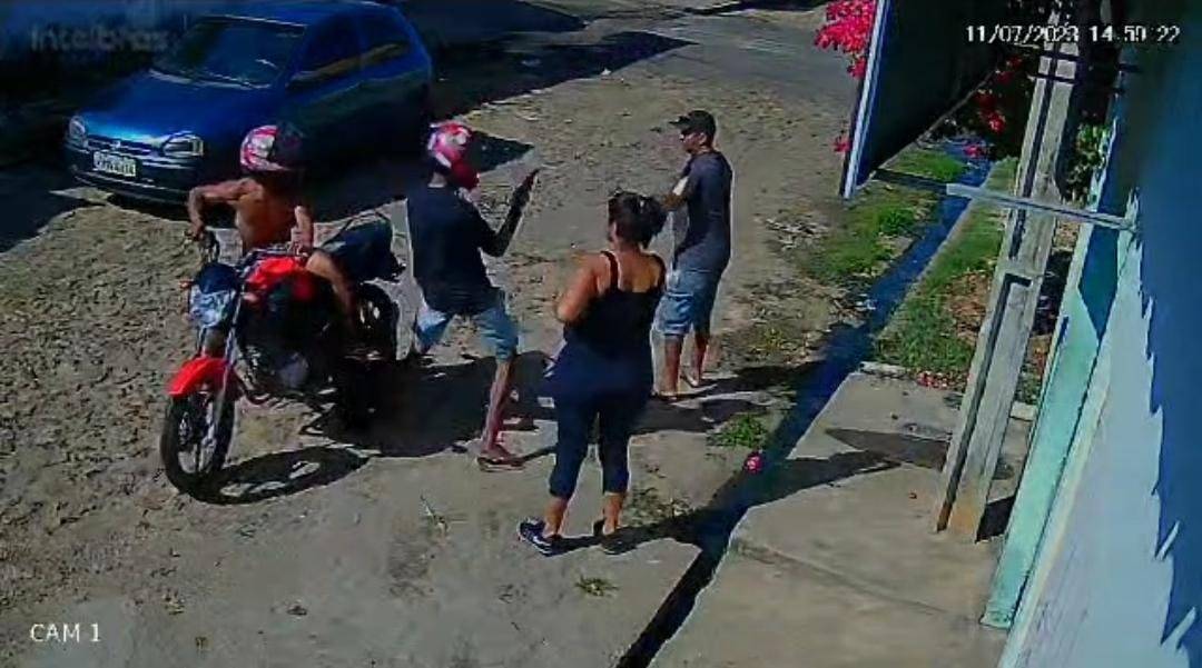 As imagens mostram o momento em que, pouco antes das 15h, dois homens chegam em uma moto vermelha, apontam a arma para as vítimas e roubam celulares e outros pertences. No vídeo é possível perceber que a mulher tentou esconder o celular embaixo da blusa antes de ser abordada pelos indivíduos, mas acabou entregando o aparelho para os suspeitos.